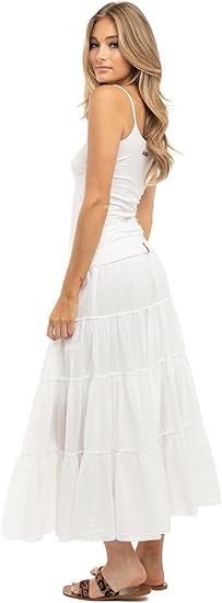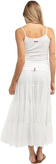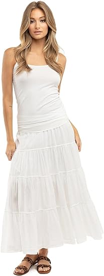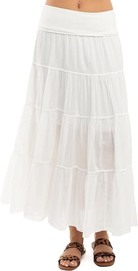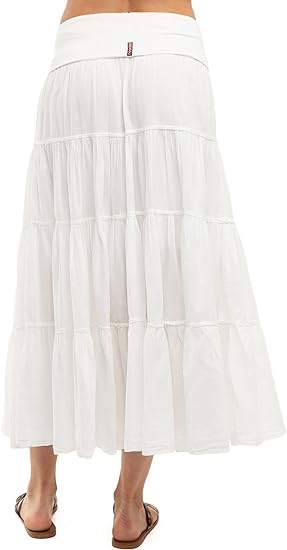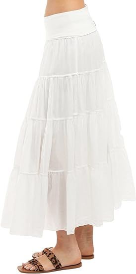 - Ankle length tiered, double layered skirt with stretch roll down waist band. This Skirt is perfect for work or play